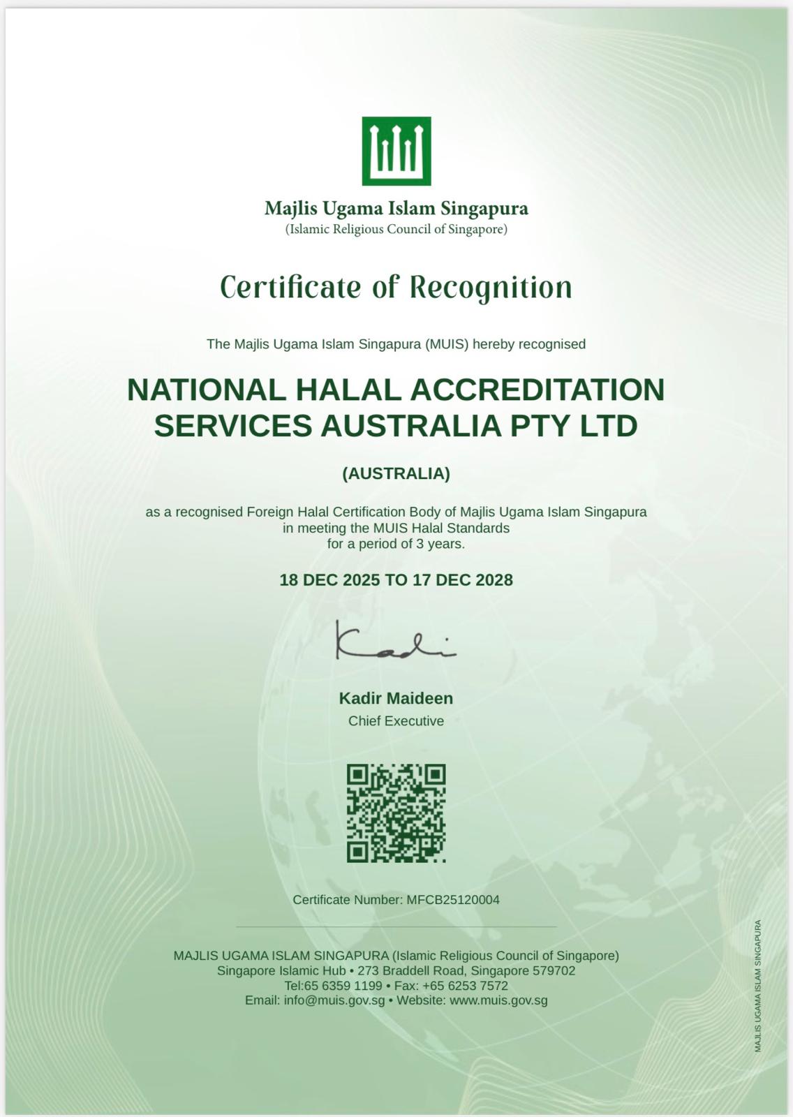 National Halal Accreditation Services now has an approved arrangement with the Department of Agriculture, Fisheries and Forestry for the certification of halal red meat and red meat products for export, and are considered an Approved Islamic Organisation (AIO).